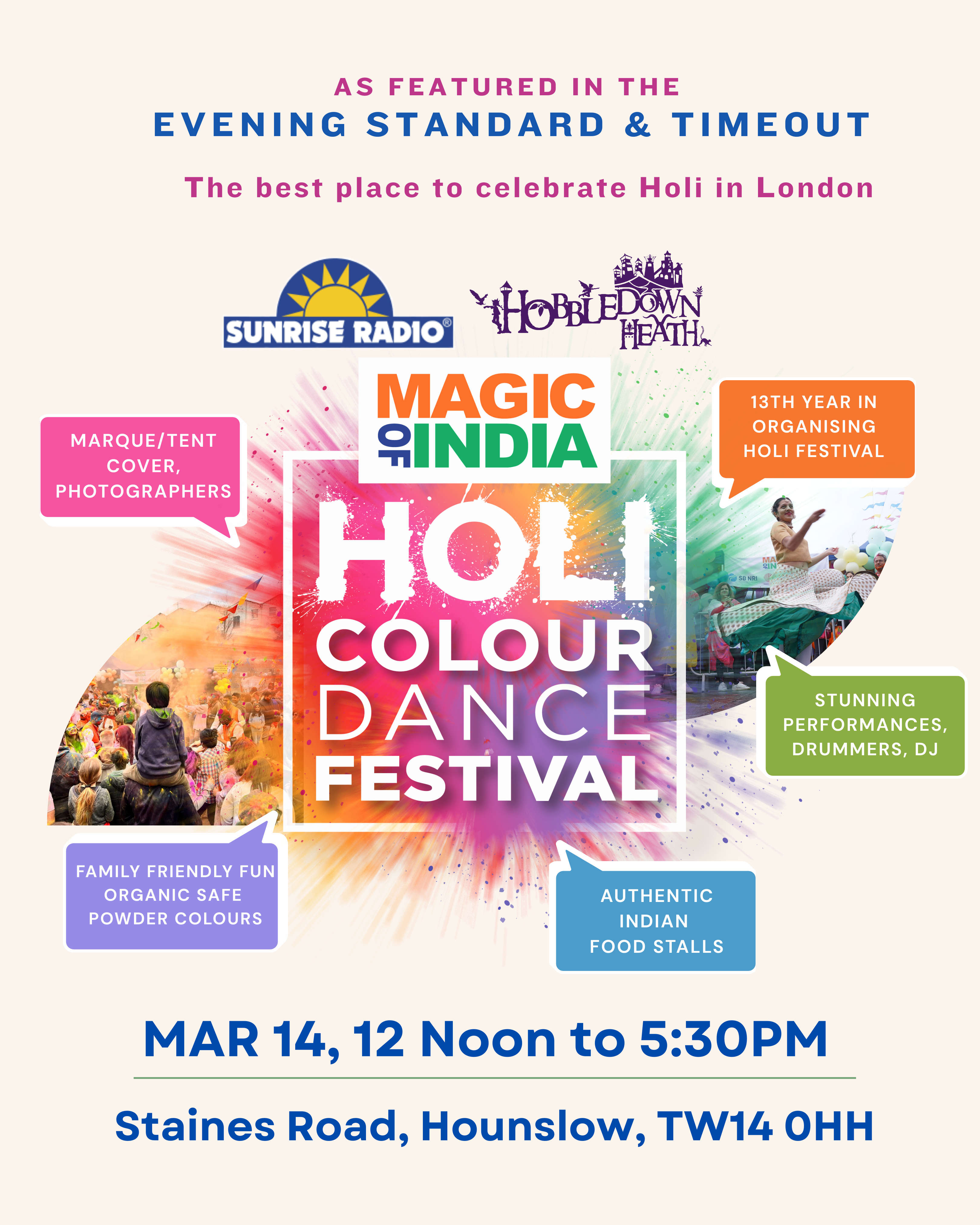 Celebrate Holi at the Patch at Hobbledown Heath this year with great performances, dancers, bhangra, dhol troops, DJ, with safe powder colours. Marque Tent. A variety of authentic indian food stalls- Dosas, Biryani, Momos, Chaat. Fun for the family. Parking can be reserved (No Amex).